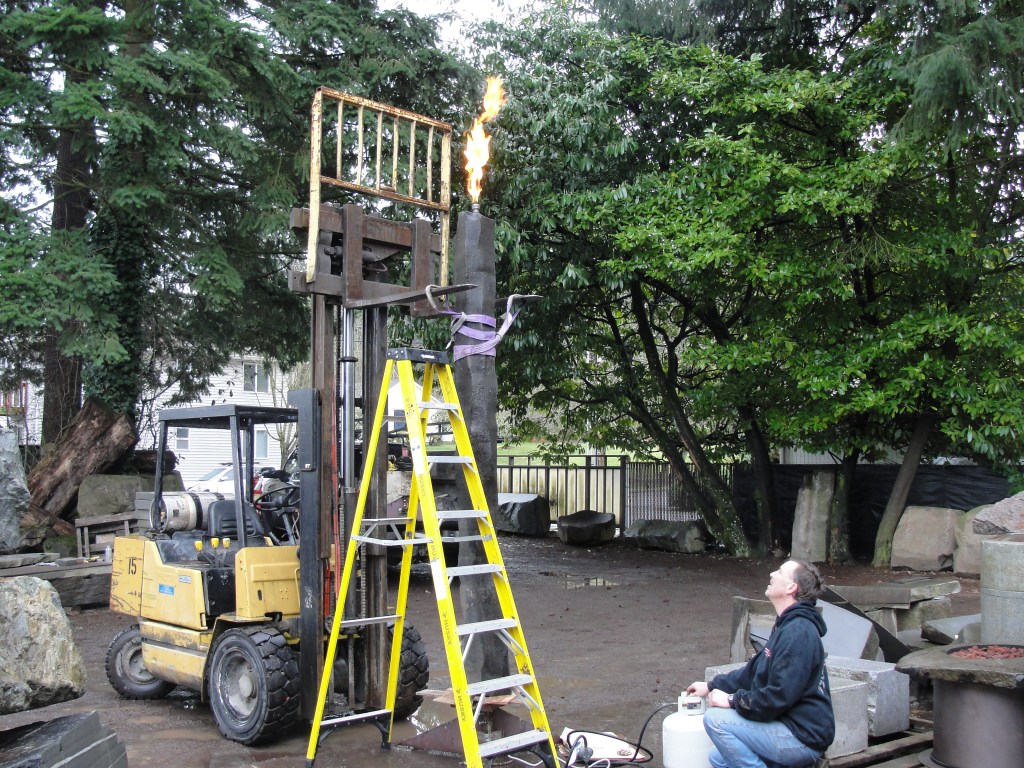 I found some thick wall black pipe to run inside the cored channel and used a flexible adhesive along the entire length. This metal tube is actually serving many important functions: obviously supply of the gas to the head, it’s also structural in the sense that it will go a serious distance keeping the stone column intact even if there were to be a fissure or break in the column – the purposeful use of a flexible adhesive running it’s length keeps the thermodynamic movements of the stone and the metal core isolated; it’s also extending out past the base, which in turn uses the extra-thick wall of the black metal pipe as part of the base support mechanism by nesting into a receiver somewhat like a Christmas tree stand. Simple, eloquent and very effective. Just as I like it to be when possible.